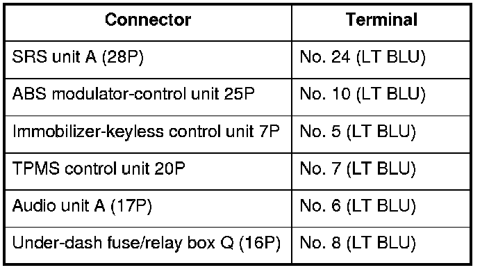 NO - Repair short in the wire between the DLC (K-line) and the ABS modulator-control unit, the SRS unit, the immobilizer-keyless control unit, the TPMS control unit (with TPMS), the audio unit, or the under-dash fuse/relay box.