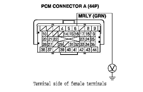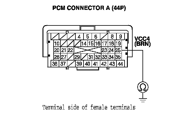 55. Measure the voltage between PCM connector terminal A6 and body ground.