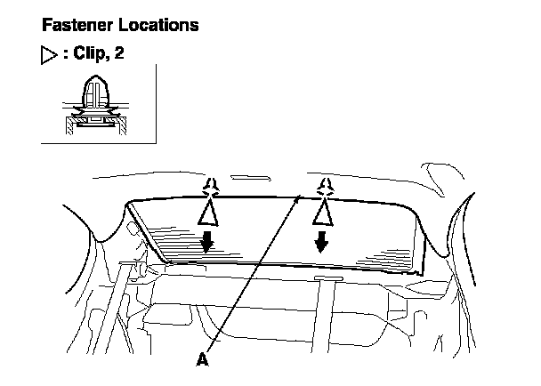 4. Pull down the rear area of the headliner (A) by detaching the clips. Take care not to bend the headliner excessively, or you may crease or break it.