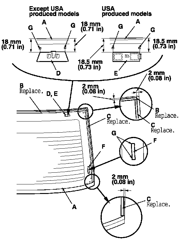 13. Apply glass primer to the upper clip mounting areas on the rear window (A), and let it dry. Attach the upper rubber dam (B), the side rubber dams (C), the clips (D) (except USA produced models), the upper fasteners (E) (USA produced models), and the side fasteners (F) with adhesive tape to the inside face of the rear window as shown: