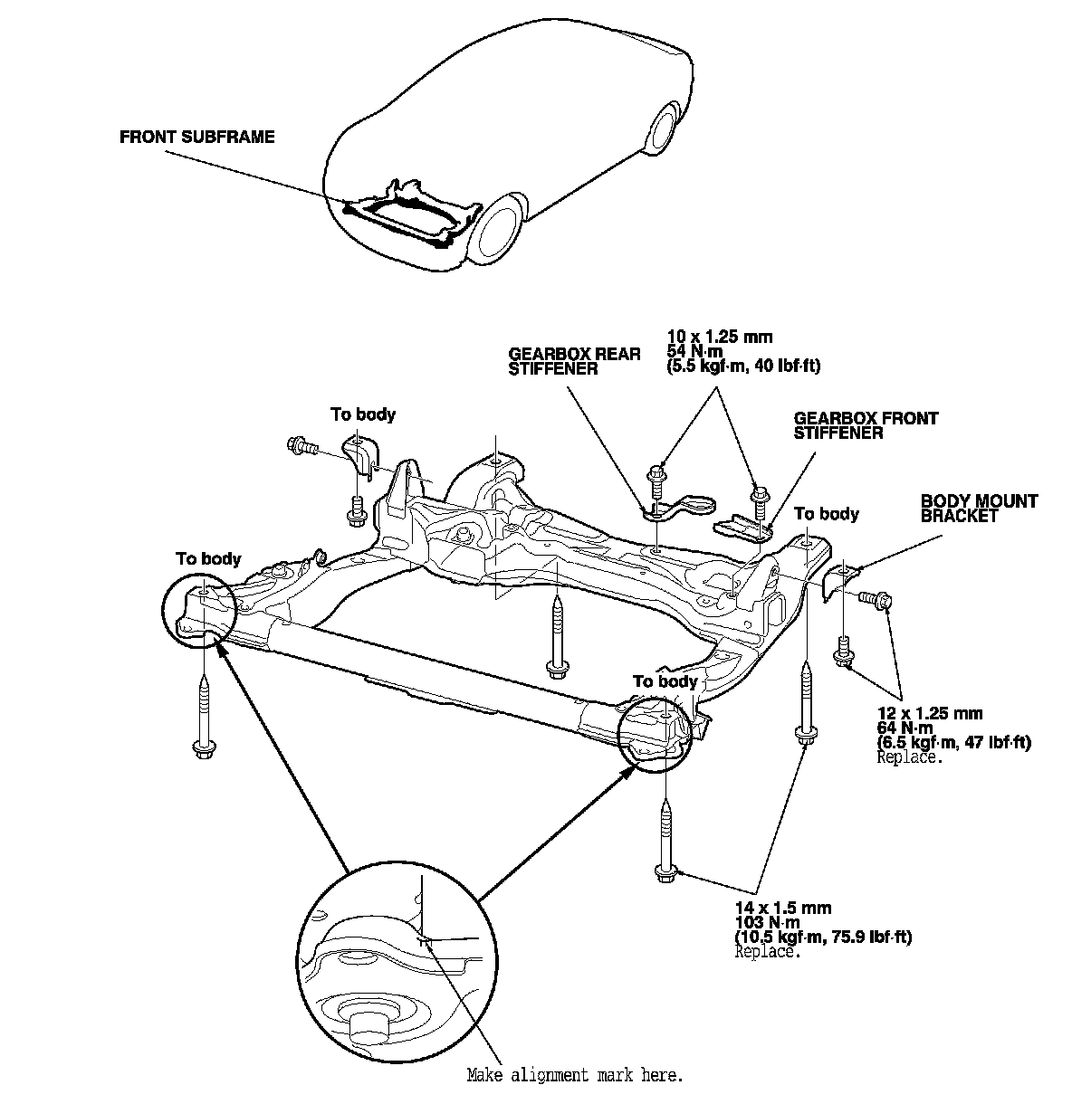 - Before removing the subframe, make a mark where the subframe lines up with the body for reinstallation.