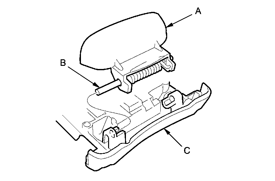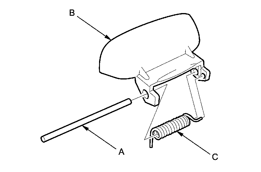 7. Remove the armrest lock pin (A), then separate the armrest lock (B) and the armrest lock spring (C).