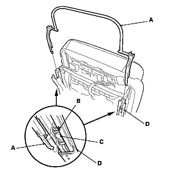 3. From under the seat cushion, lightly tap the slide lever (A) out to disconnect both ends of it from the springs (B) of the slide locks (C) in both seat tracks (D).