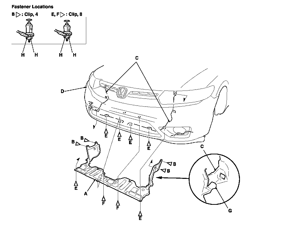 -1 Detach the clips (B) that secure the front inner fender (C) and the splash shield to the body.