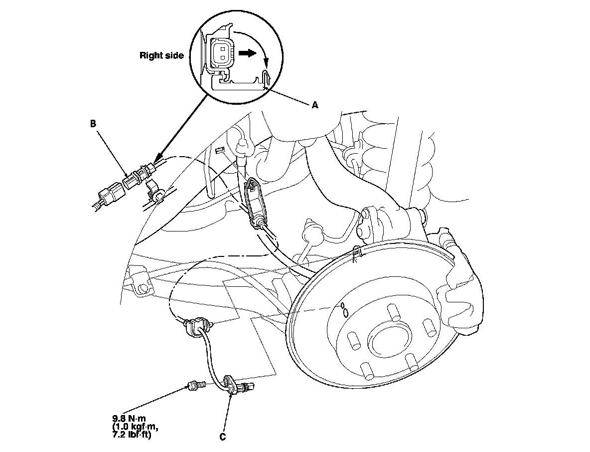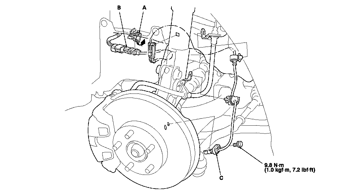 3. Remove the clips, the bolt, and the wheel speed sensor (C).