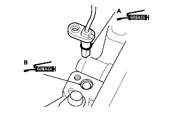4. Apply multi-purpose grease to the wheel speed sensor O-ring (A) and the sensor hole (B) in the knuckle.