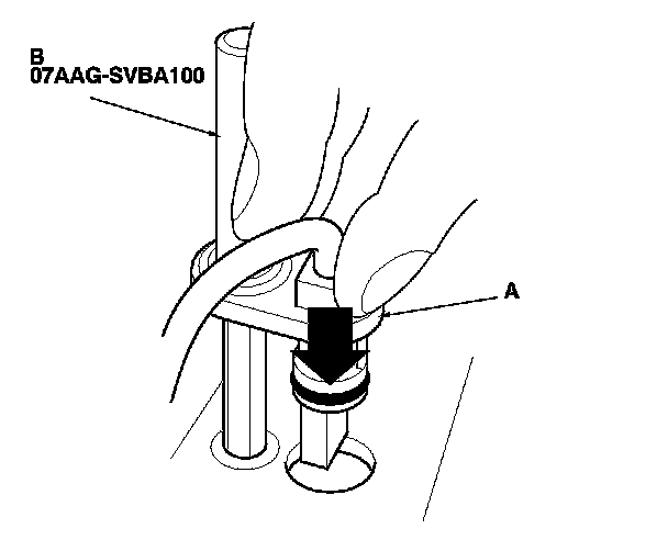 6. Insert the wheel speed sensor (A) and the guide pin tool (B) into the bolt hole on the knuckle.