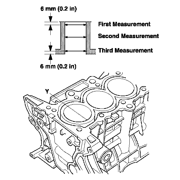 4. Measure the wear and taper Y at three levels inside each cylinder as shown. If the measurements in any cylinder are beyond the Oversize Bore Service Limit, replace the engine block. If the engine block is being rebored, refer to step 7 after reboring.