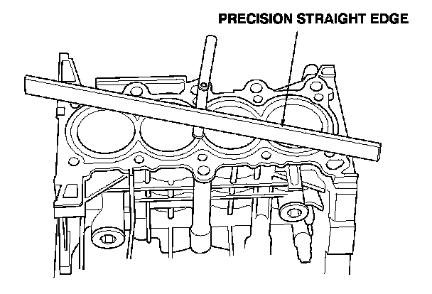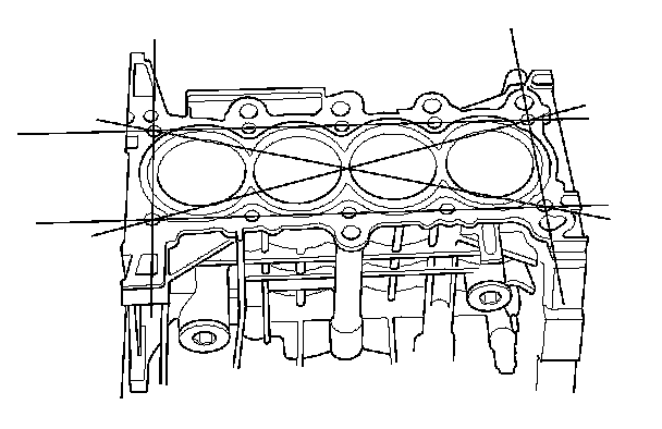 6. Check the top of the engine block for warpage. Measure along the edges, and across the center as shown.