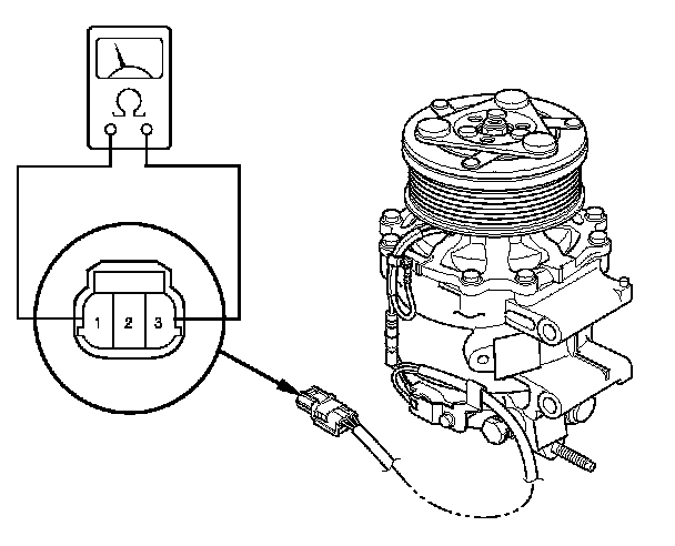 4. Check for continuity between the A/C compressor clutch connector terminals No. 1 and No. 3. If there is no continuity, replace the thermal protector. A/C Compressor Thermal Protector Replacement
