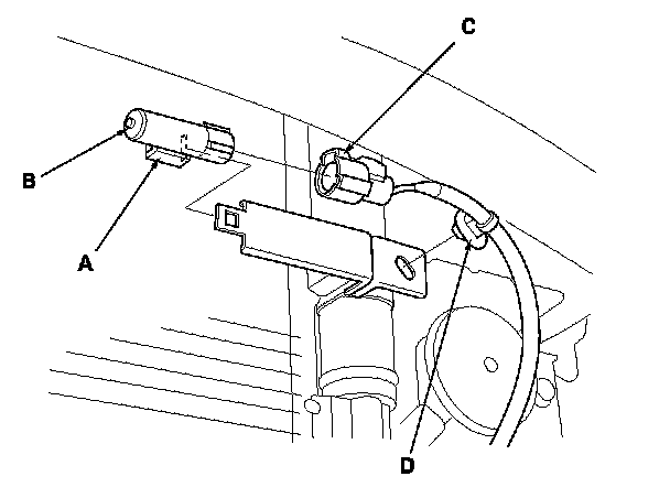 6. Lift the tab (A) to release the lock, then remove the outside air temperature sensor (B) from the receiver/dryer desiccant bracket. Disconnect the 2P connector (C), then remove the clip (D).