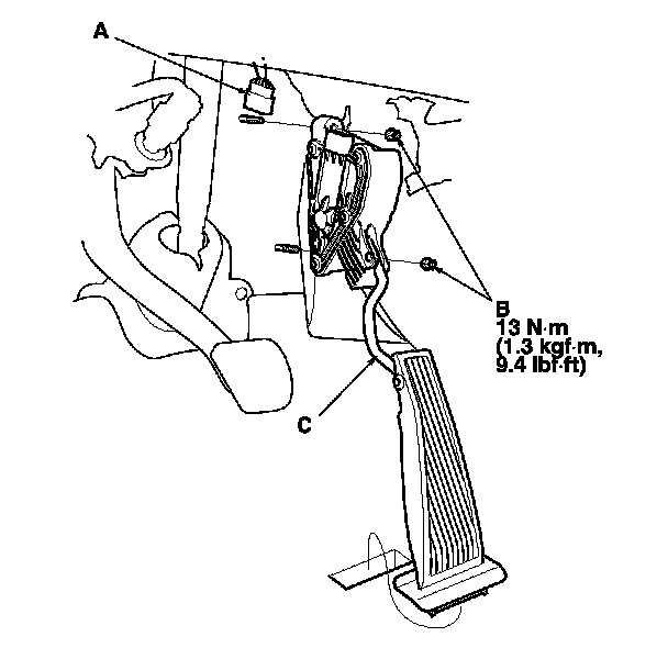 6. Install the accelerator pedal module (C) with a new clip (D).