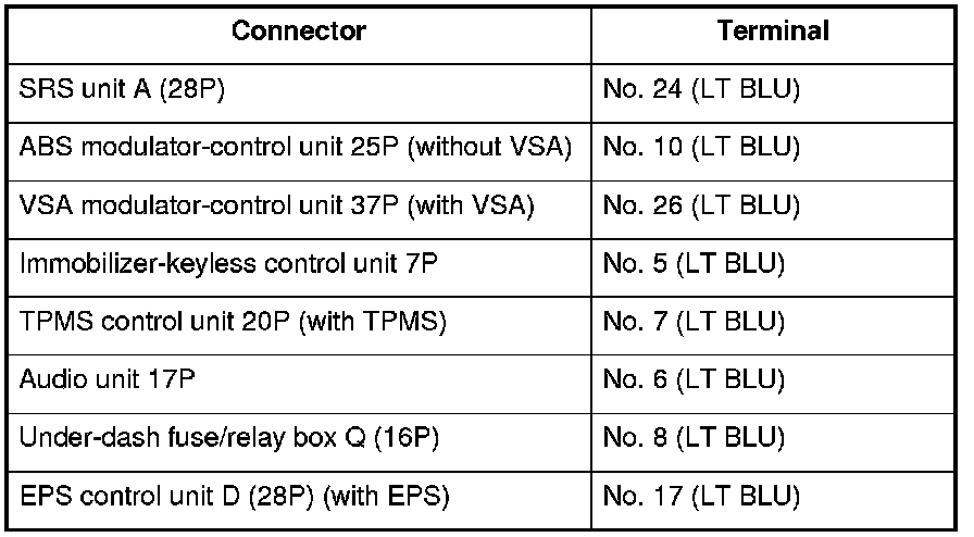 NO - Repair short in the wire between the DLC (K-line) and the ABS modulator-control unit (without VSA), the VSA modulator-control unit (with VSA), the SRS unit, the immobilizer-keyless control unit, the TPMS control unit (With TPMS), EPS control unit (with EPS), the audio unit, or the under-dash fuse/relay box.