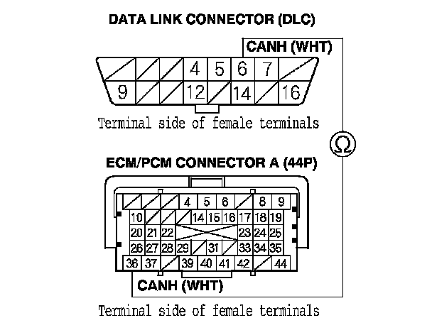 35. Check for continuity between ECM/PCM connector terminal A36 and DLC terminal No. 6.