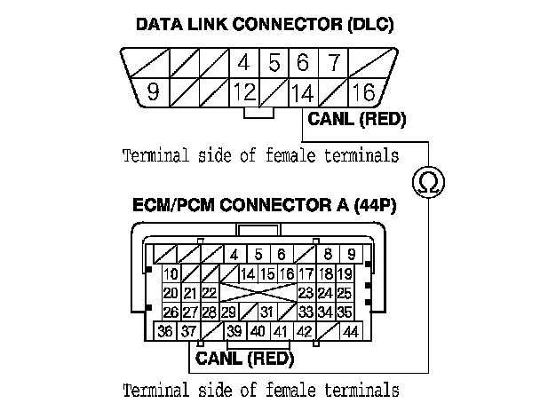 36. Check for continuity between ECM/PCM connector terminal A37 and DLC terminal No. 14.
