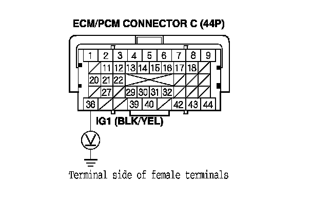 61. Measure the voltage between ECM/PCM connector terminal C36 and body ground.