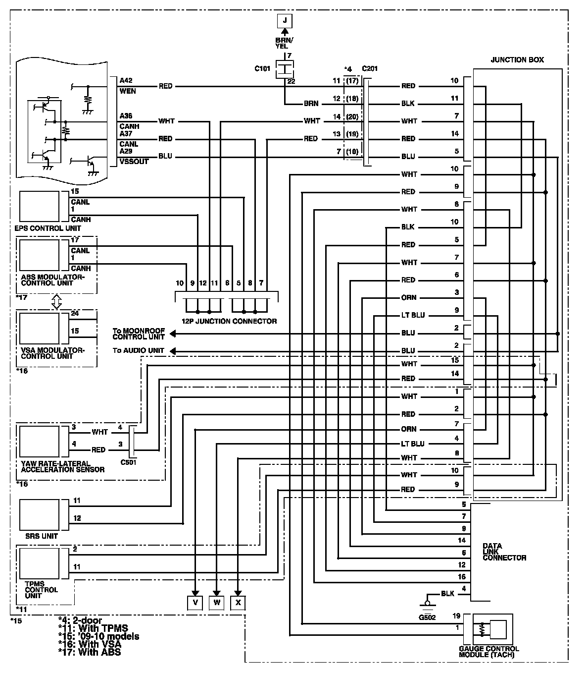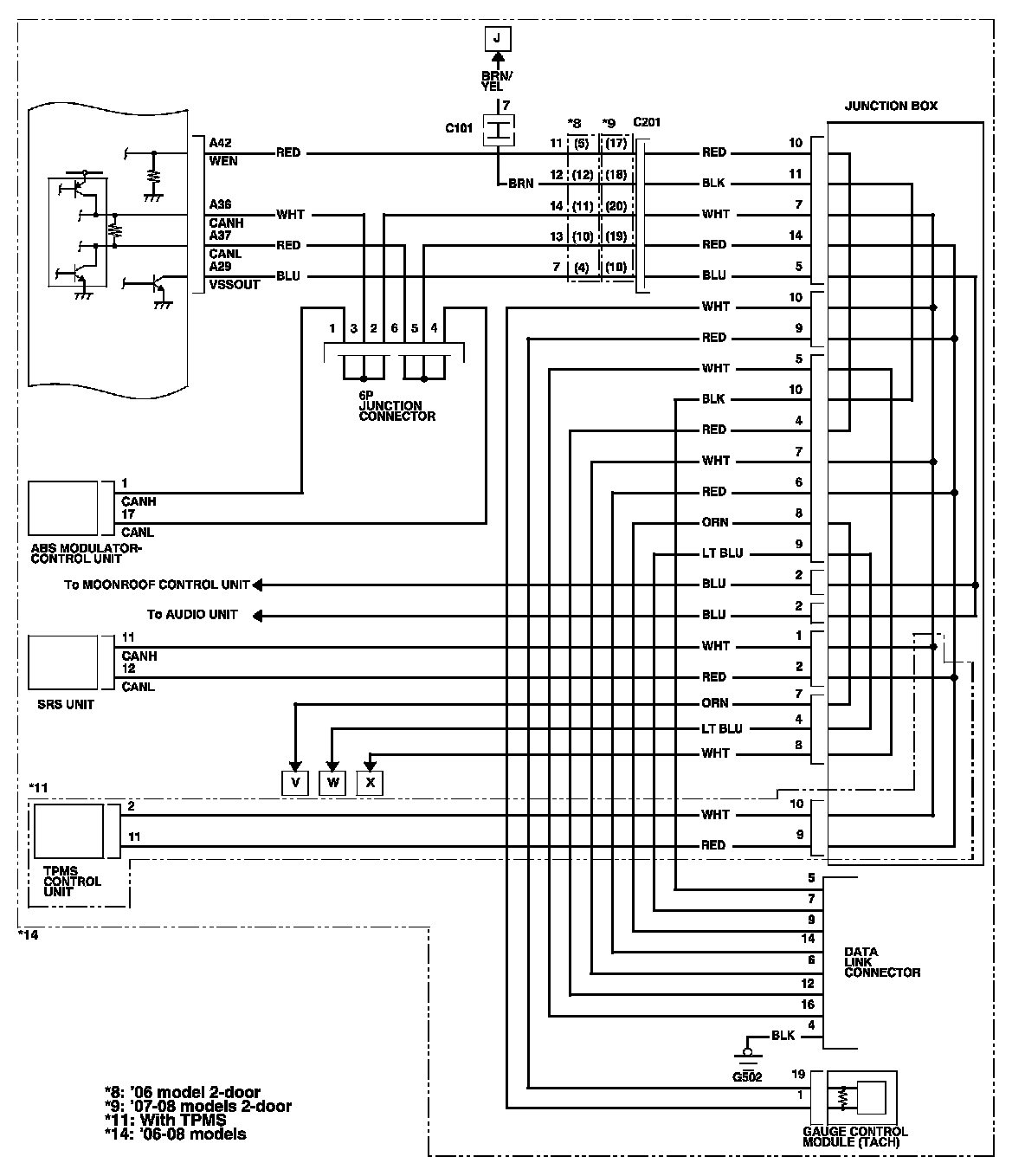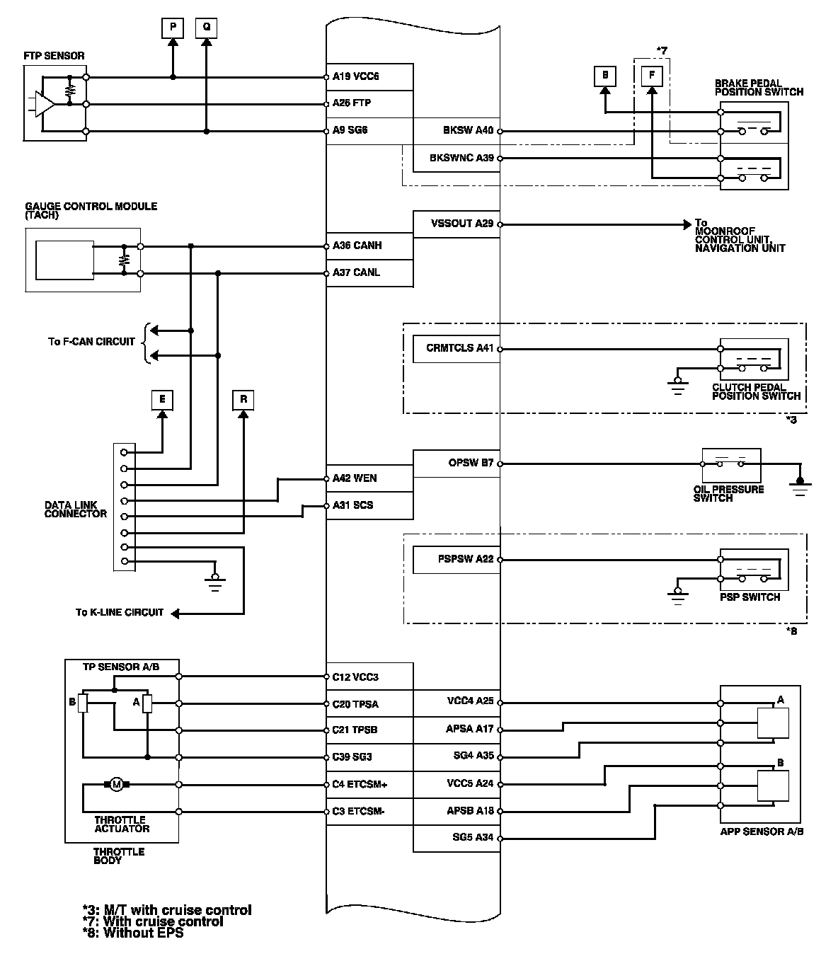 The ECM/PCM detects a failure of a signal from a sensor or another control unit and stores a Pending DTC or a Confirmed DTC. Depending on the failure, a Confirmed DTC is stored in either the first or the second drive cycle ('06 model: DTC P0457 turns on the malfunction indicator lamp (MIL) during the third drive cycle). When a Confirmed DTC is stored, the ECM/PCM turns on the malfunction indicator lamp (MIL) by a signal sent to the gauge via F-CAN.