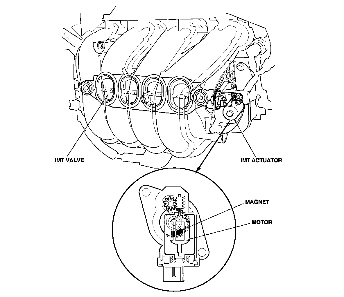 The intake manifold tuning (IMT) valve actuator contains a sensor that detects the IMT valve position and sends it to the ECM/PCM.
