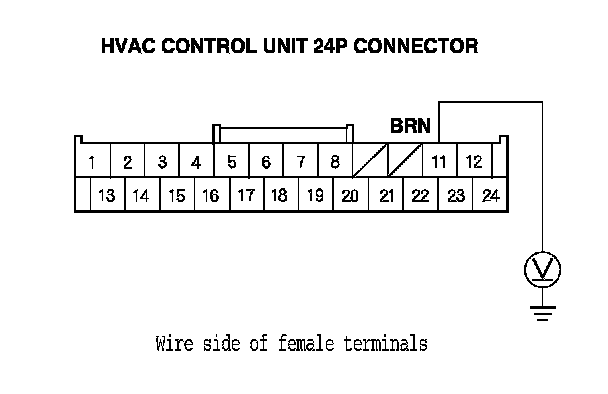 7. Measure the voltage between HVAC control unit 24P connector terminal No. 11 and body ground.