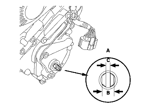 10. Remove the transmission range switch, and check the end of the selector control shaft (A).