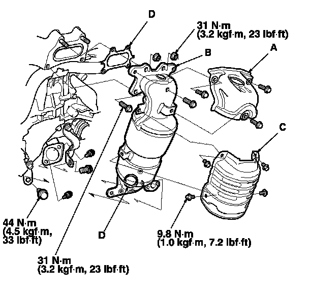 7. Install the parts in the reverse order of removal with new gaskets (D).