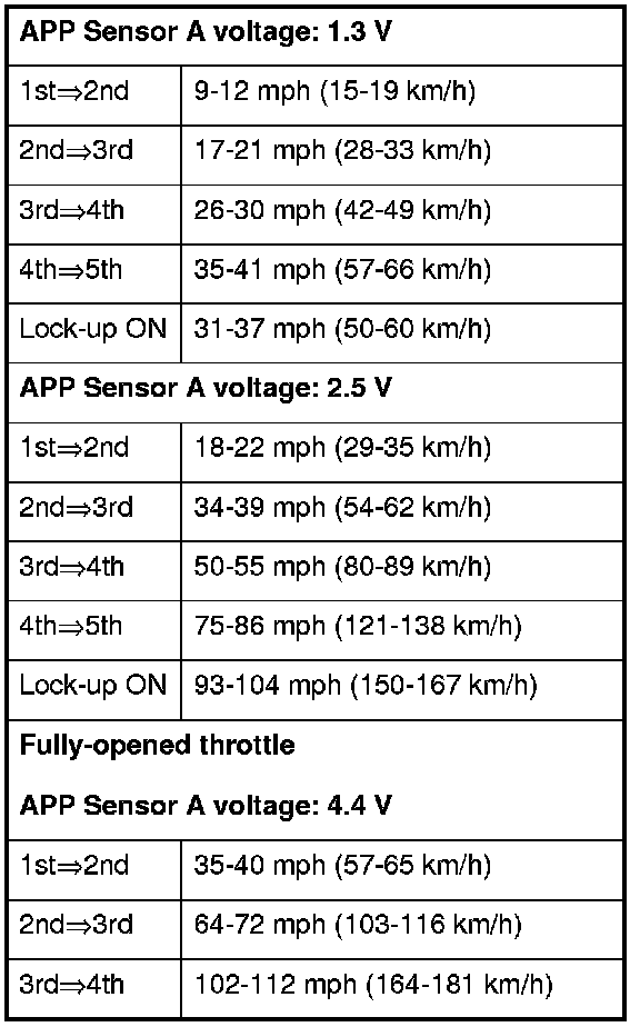 14. Review each snapshot individually and compare the Shift Control, APP Sensor A (V), and the Vehicle Speed to the following table: