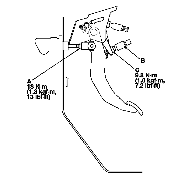 2. Loosen the clutch pedal position switch locknut (A), and back off the clutch pedal position switch (B) until it no longer touches the clutch pedal (C).