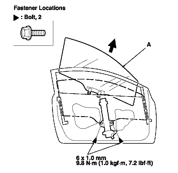 4. Lower the glass (A) until you can see the bolts, then remove them. Carefully pull out the glass through the window slot. Take care not to drop the glass inside the door.