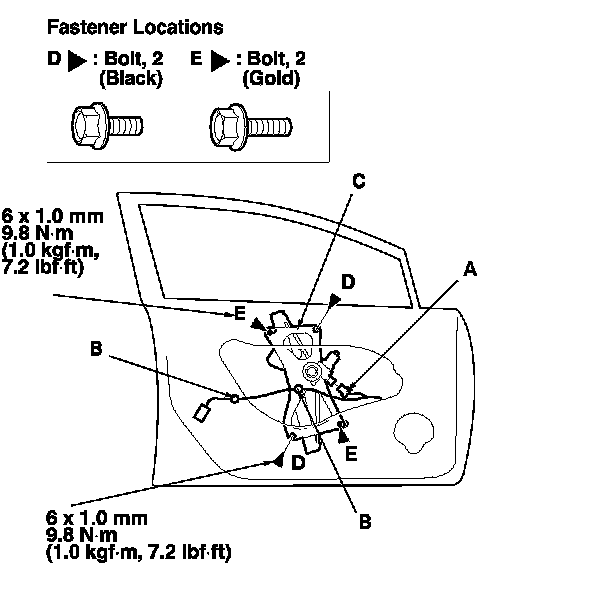 6. Remove the bolts (D), and loosen the bolts (E), then remove the regulator through the hole in the door.