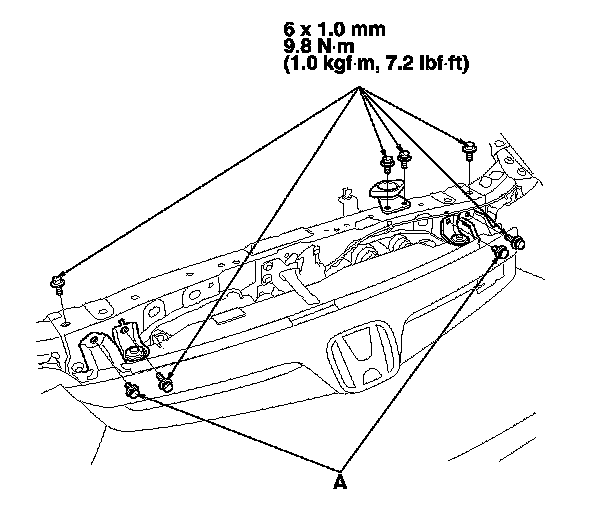 10. Remove the mounting bolts and the A/C compressor (A). Be careful not to damage the radiator fins when removing the A/C compressor.
