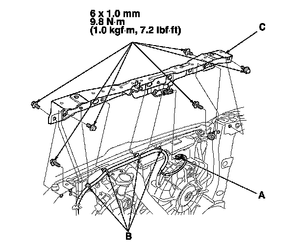 5. Remove the bolts, the connector (A), the wire harness clips (B), and the bulkhead (C).