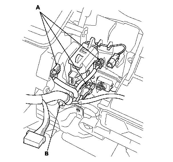 9. Disconnect the connectors (A) from the mode control motor, the evaporator temperature sensor, and the power transistor. Remove the wire harness clip (B).