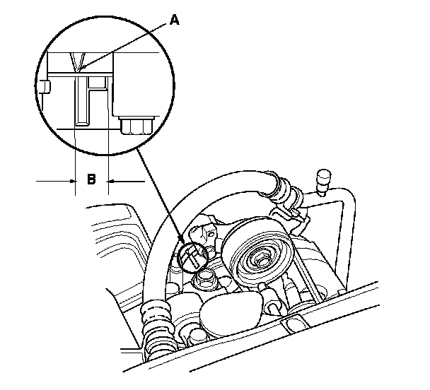 2. Check the position of the auto-tensioner indicator pointer (A) is within the standard range (B) as shown. If it is out of the standard range, replace the drive belt. Service and Repair