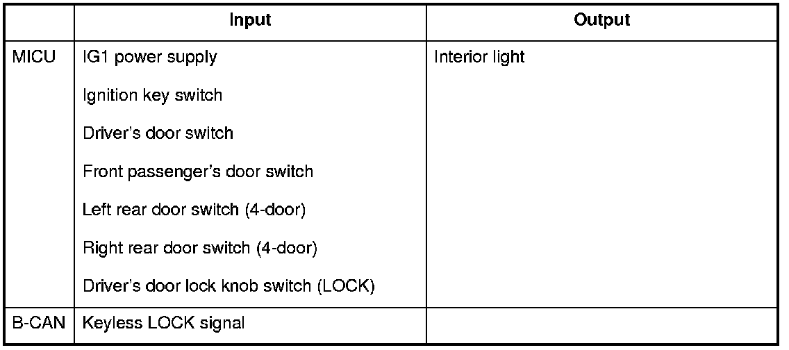 The MICU contains the relay circuits of the headlight high/low beam and taillights, and controls the lighting system ON/OFF based on inputs from the combination light switch.