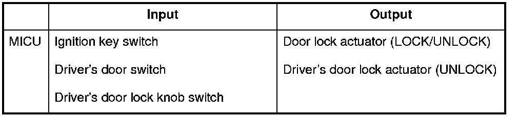 The MICU control of the door lock actuators is based on ignition key switch, driver's door switch, and driver's door lock knob switch inputs.