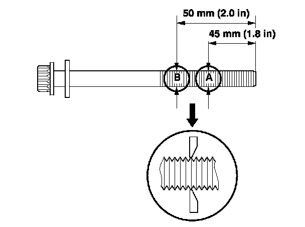 Measure the diameter of each cylinder head bolt at point A and point B.
