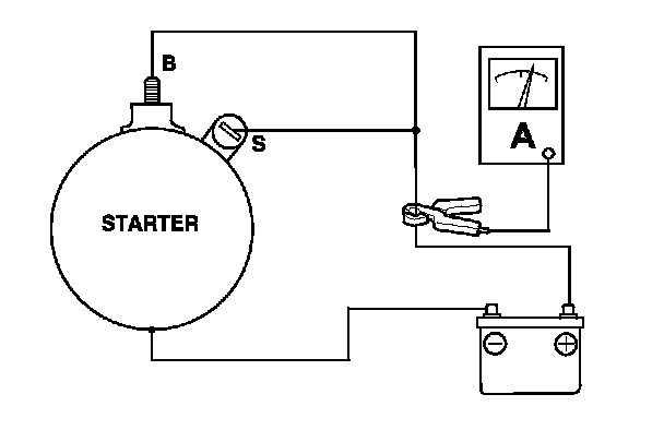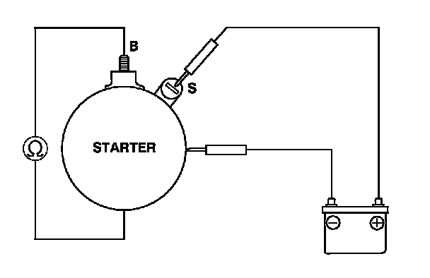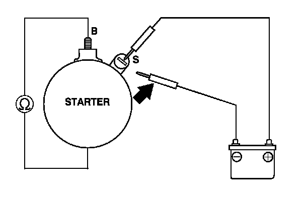 4. Connect the battery as shown, and check for continuity between the B terminal and the starter body. If there is continuity, it is working properly.