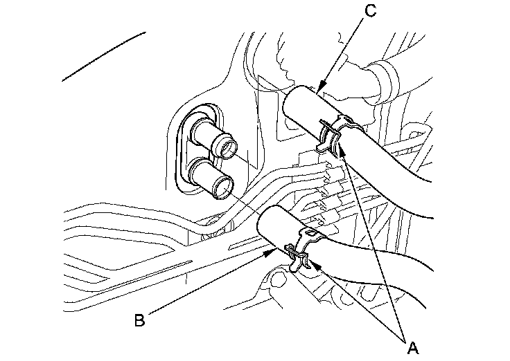 5. From under the hood, slide the hose clamps (A) back. Disconnect the inlet heater hose (B) and the outlet heater hose (C) from the heater unit. Note the layout of the hoses.