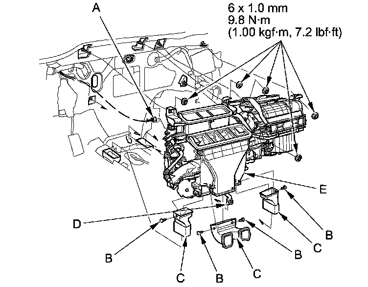 8. Disconnect the connector (A). Detach the clips (B). Remove the ducts (C) and the drain hose (D). Then remove the mounting nuts and the blower-heater unit (E).