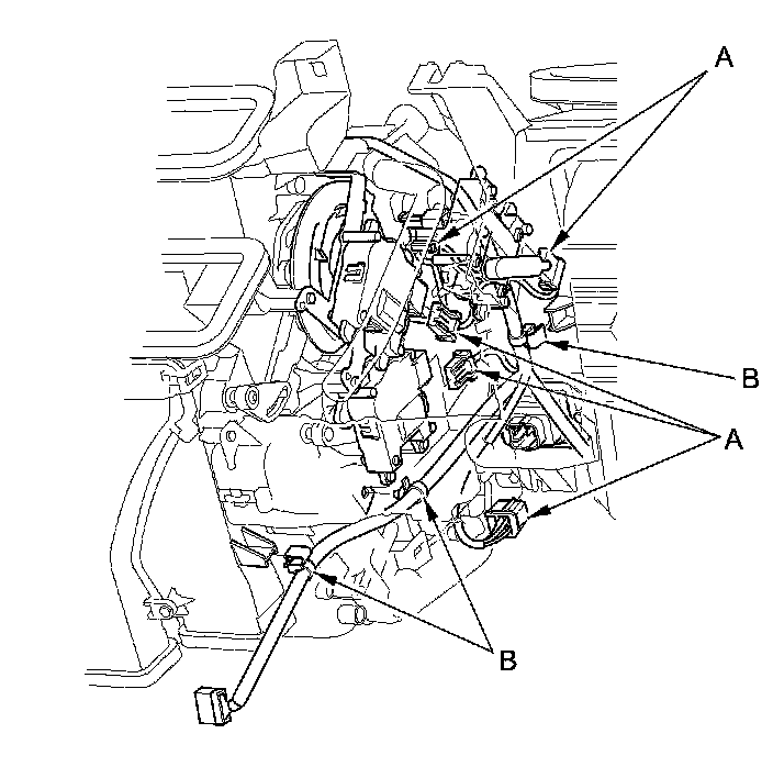 10. Disconnect these connectors (A): The mode control motor, the power transistor, the evaporator temperature sensor, the passenger's air mix control motor, and the recirculation control motor. Detach the harness clips (B).