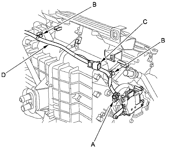 11. Disconnect the connector (A) from the driver's air mix control motor. Detach the harness clips (B), the connector clip (C), and remove the wire harness (D).