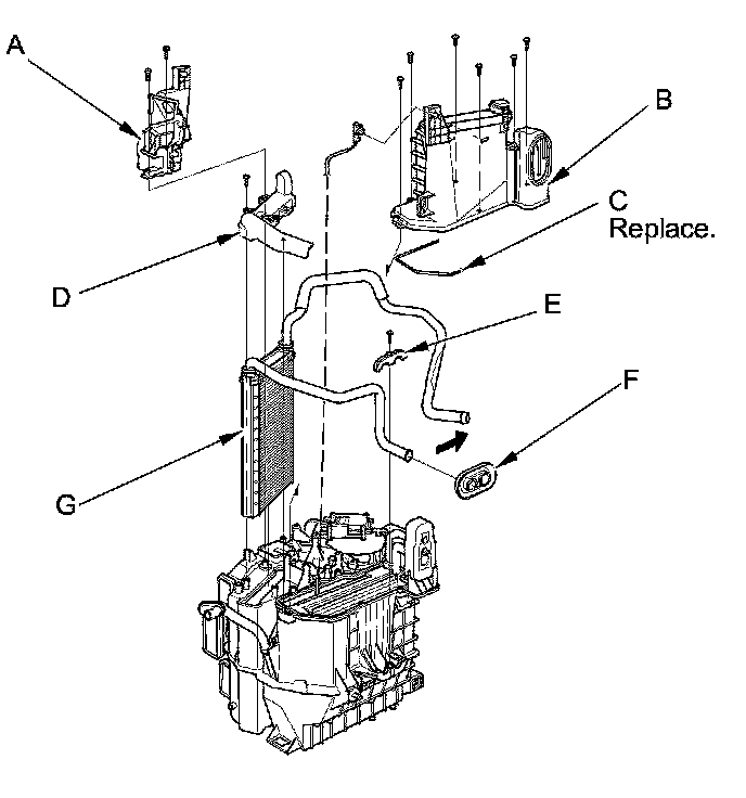14. Remove the self-tapping screws, the heater pipe bracket (E), and the grommet (F), and carefully pull out the heater core (G).