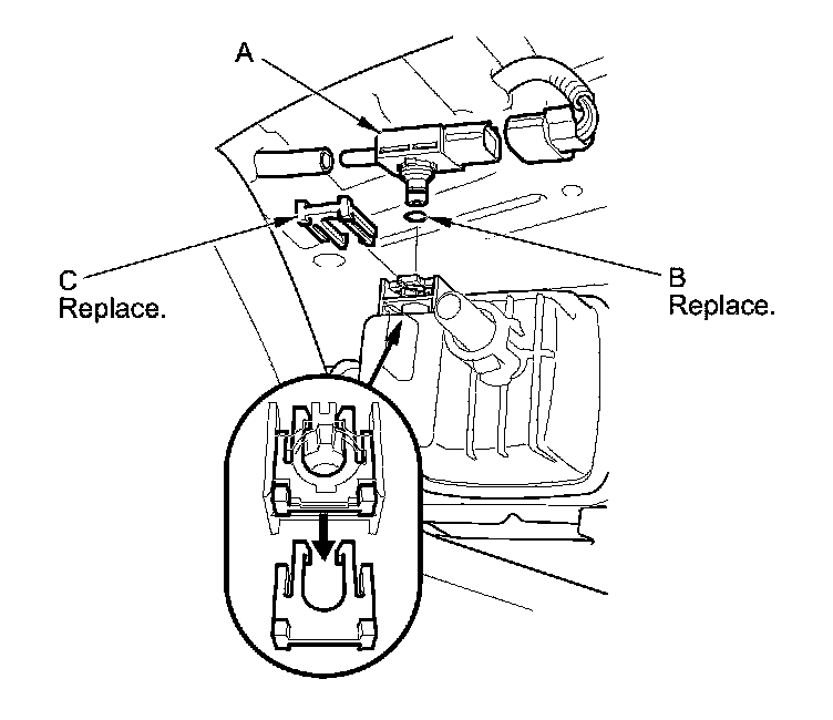 4. Install the parts in the reverse order of removal with a new O-ring (B) and a new retainer (C).