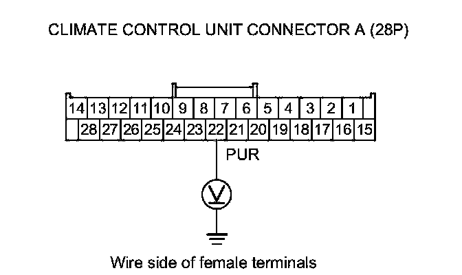 7. Measure the voltage between climate control unit connector A (28P) terminal No. 22 and body ground.