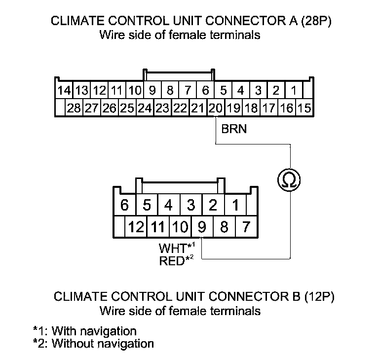 11. Measure the evaporator temperature sensor resistance between climate control unit connector A (28P) terminal No. 20 and connector B (12P) terminal No. 9.