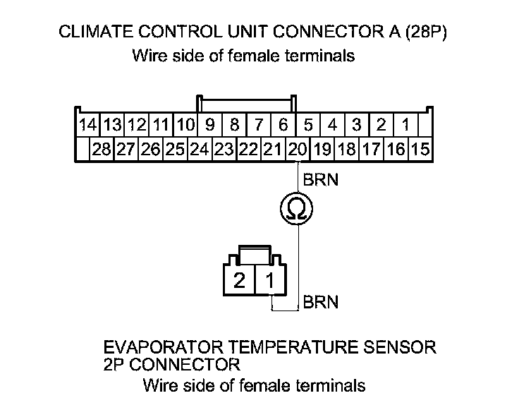 13. Check for continuity between climate control unit connector A (28P) terminal No. 20 and evaporator temperature sensor 2P connector terminal No. 1.