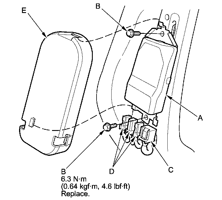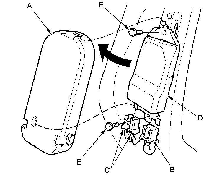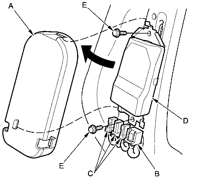 1. Place the ODS unit (A) on the seat-back frame. Tighten the two bolts (B), then connect the ODS unit 18P connector (C) and OPDS sensor connectors (D) to the ODS unit. Reinstall the cover (E).