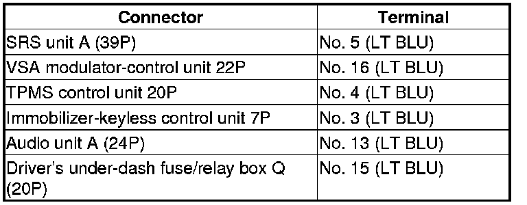 Repair a short in the wire between the DLC (K-line) and the VSA modulator-control unit, the SRS unit, the TPMS control unit, the immobilizer-keyless control unit, the audio unit, or the driver's under-dash fuse/relay box.�