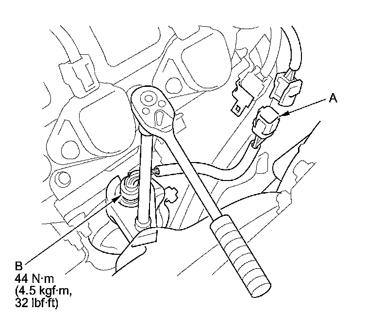 1. Disconnect the rear A/F sensor 6P connector (A), then remove the A/F sensor (B).