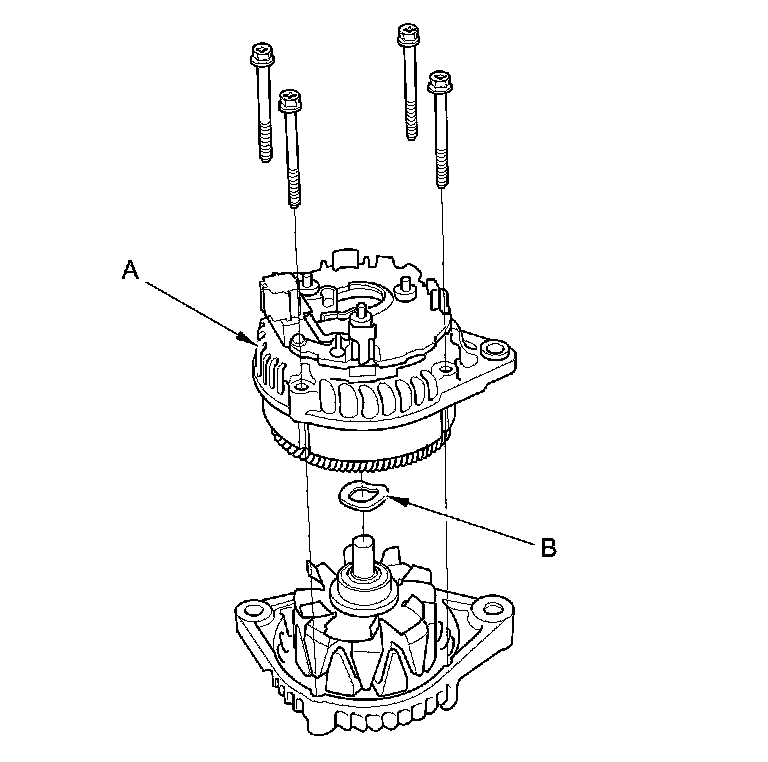 8. Remove the four through bolts, then remove the rear housing assembly (A) and the washer (B).